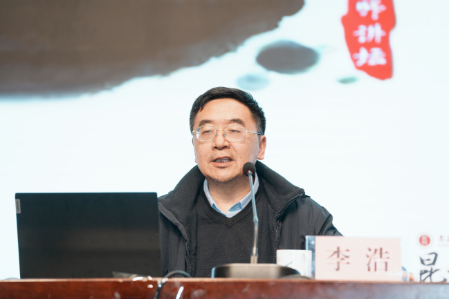 李浩教授以《中国古代文学新材料研究的四境界》为主题,以新材料、新问题与学术原创为导引,从新材料个案的呈现、材料间关联性的建立、史学书写的互映以及通过新材料建构新范型、新假说、新体系等四个方面,指出在包括石刻文献在内的新材料研究领域,中国学者的研究走在前列,但仍应继续努力,使其成为构筑自主知识体系的“压舱石”。李浩教授认为,要创造条件及时考察新材料的现地和文物遗址,从而进行创新思维,不断发明新范畴,提出新假说,建构新理论,为构建中国学术贡献力量。讲座最后,李浩教授还分享了自己由研究传世文献转向研究出土文献的契机,并鼓励在场师生要将科学研究与国家、民族、世界的发展相结合,打开学术研究视野,打破学科壁垒。李浩教授的讲述旁征博引,深入浅出,获得在场师生的一致好评。