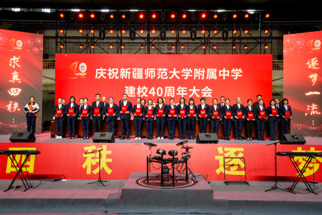 校党委书记葛国在致辞中指出,四十年来附属中学在党的坚强领导下图强奋进,攻坚克难,不忘办学之艰辛,牢记办学之使命,经过一代代附中人默默耕耘、接续奋斗,用智慧和汗水实现了一次又一次跨越式的发展,凝练了附中“千教万教教人求真,千学万学学做真人”的求真校训,形成了“勤业、敬业、追求卓越”的优良校风,打造了“一校两地七区”的教学格局,培养了各行各业一大批栋梁之材,赢得了社会各界的广泛赞誉。葛国强调,站在四十周年新的起点,希望附属中学聚焦“实验性、示范性、有特色、高质量”办学目标,努力成为首府乃至新疆基础教育发展的排头兵;希望广大教师争当“四有”好老师,努力成为塑造学生的“大先生”;希望附属中学广大学子树立远大的目标,立志做有理想、敢担当、能吃苦、肯奋斗的新时代好青年。