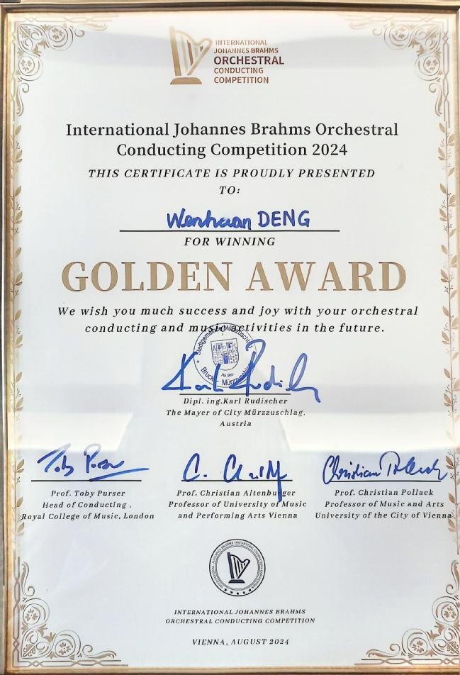 8月2日至4日,由奥地利米尔茨市政府主办的“2024勃拉姆斯国际乐团指挥比赛”在世界音乐之都维也纳成功举行。经大赛评委会评选,365英国音乐学院教师邓文欢荣获赛事金奖。