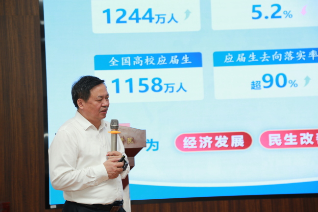 3月24日下午,校党委书记蒋海军以《当前就业形势与实施就业优先战略》为题,围绕大学生就业这一备受关注的热点话题为政法学院、中国语言文学学院学生讲授了“开学第一课”。他从宏观视角全面剖析了当下就业总体形势,精准细致地解读了国家以及自治区出台的一系列就业政策。同时,针对当前就业市场存在的诸如供需结构不匹配、部分行业竞争激烈等问题进行了深度剖析,并结合实际提出了切实可行的意见与建议。