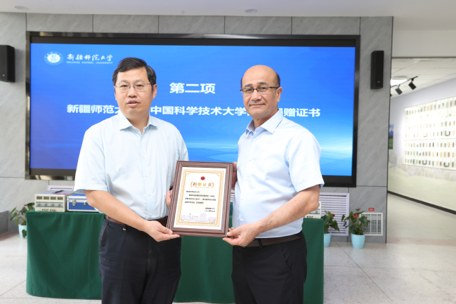 校党委副书记、校长吾满江·艾力为中国科学技术大学党委副书记邓建松回赠捐赠证书