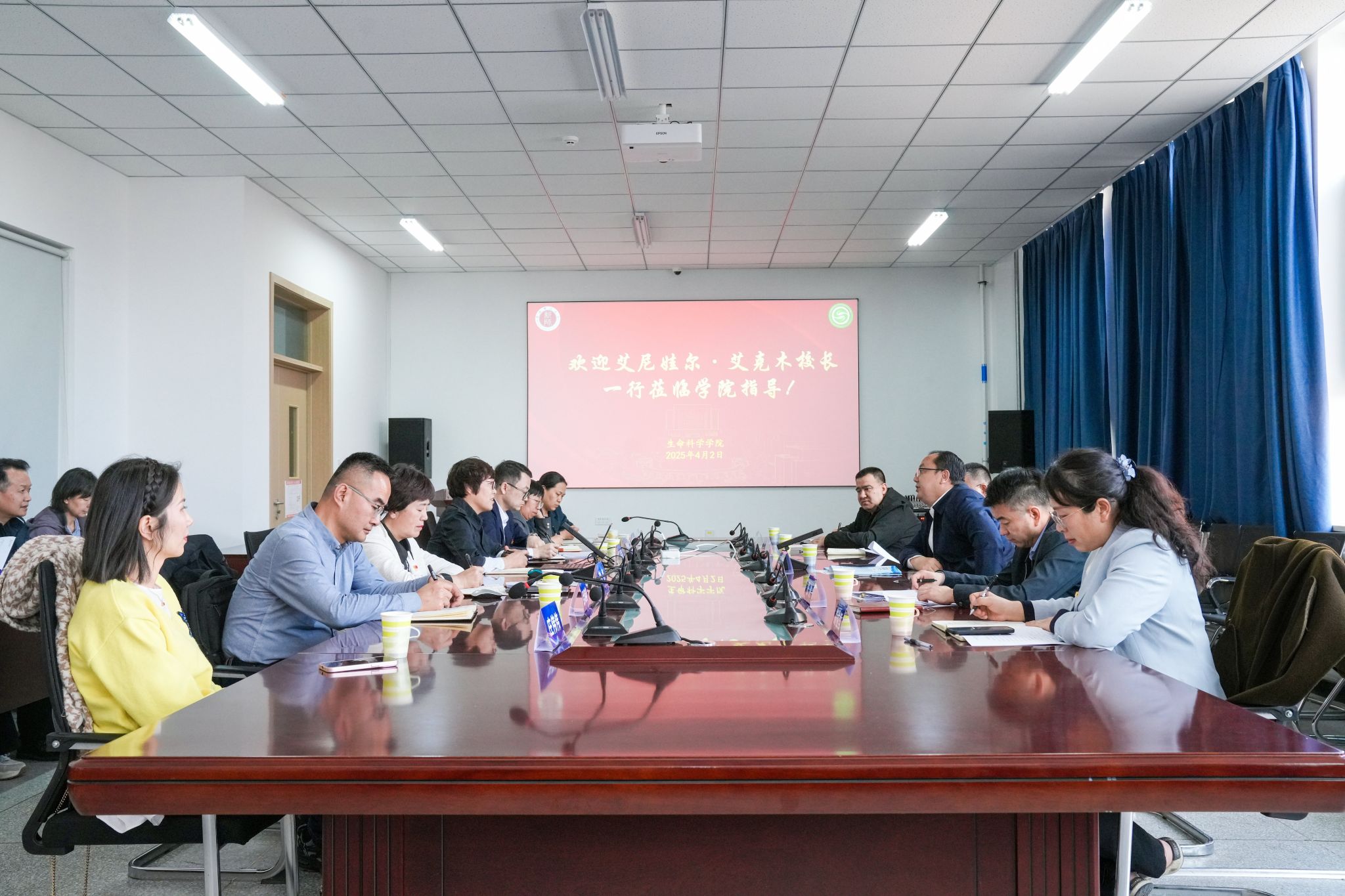 在生命科学学院,艾尼娃尔·艾克木与学院领导班子、中层干部、教学骨干、学科带头人和教师代表进行座谈,详细了解学院党建工作、学科建设、人才引进、团队建设、科学研究、学生就业等情况,并就学院今后发展提出指导意见:一是聚焦AI赋能教育,积极培育“AI+生物学”交叉学科,打造学院特色优势专业;二是进一步加强科学研究,突破发展瓶颈,集中力量争取高水平论文和专著出版;三是打破学科壁垒,积极探索“专微融合”人才培养新模式;四是深化“药食同源”特色研究方向,联合龙头企业共建产业学院,促进学院产学研融合发展;五是利用学院学科优势,推动南北疆重点实验室共建及资源共享机制落地;六是抢抓转型机遇,以服务国家战略需求为导向,全面启动向“新工科”“新医科”的战略转型;七是积极开拓援疆高校资源,建立常态化帮扶机制,在教师访学进修、科研合作、资源共享等方面争取全方位支持,争取培育出一批教学名师与行业专家,为学院转型升级提供人才支撑。