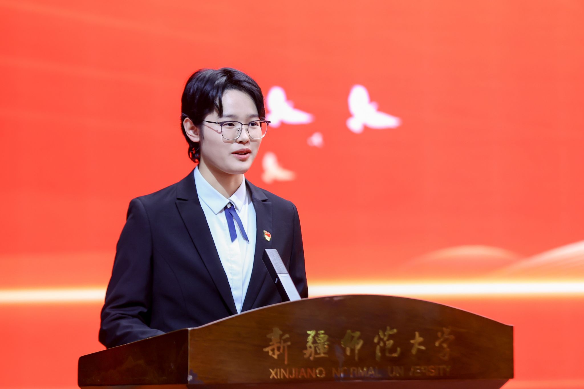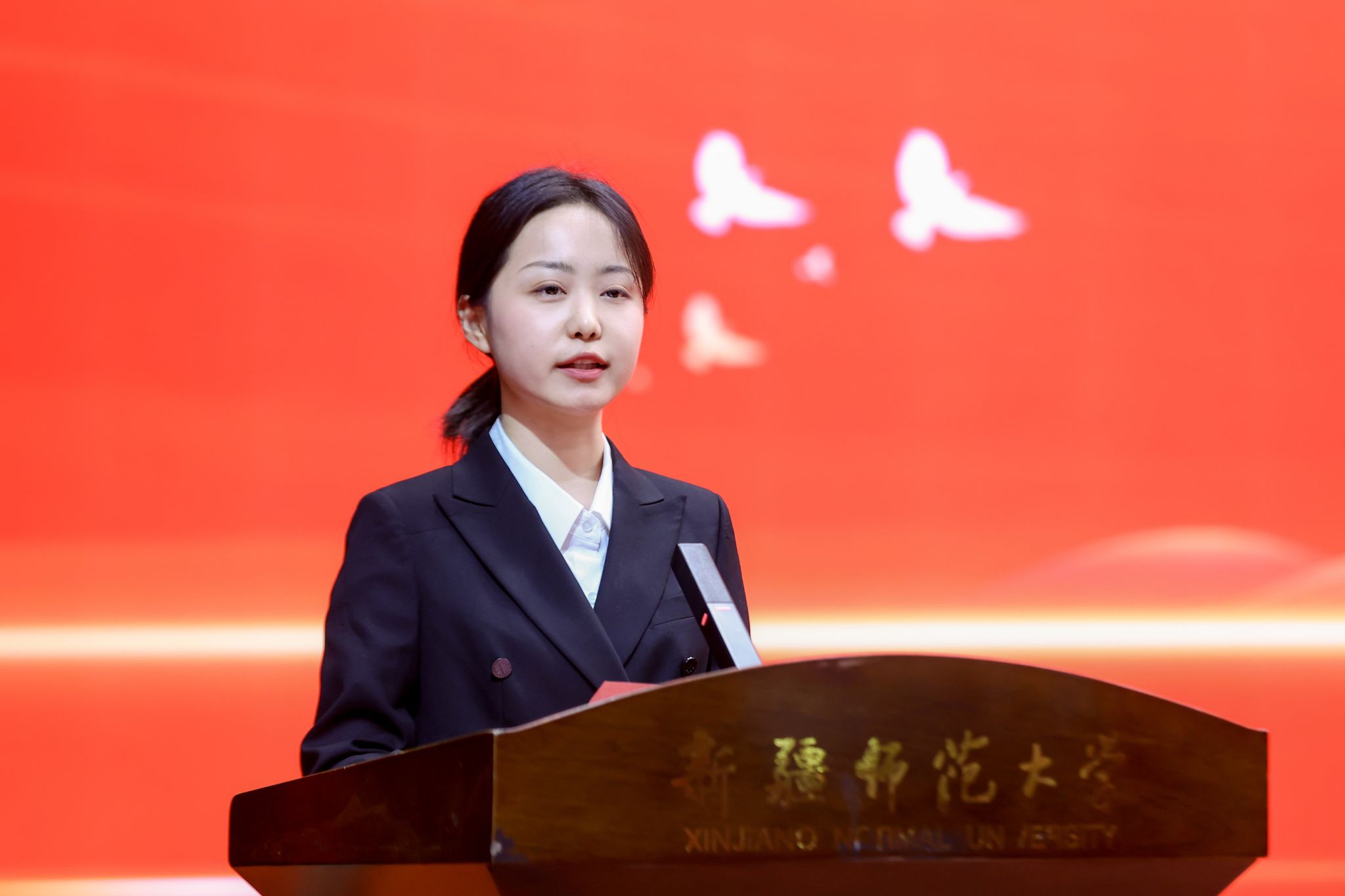 表彰结束后,国家奖学金获得者、教育科学学院孙一尧同学分享了自己在学业与实践中追求卓越的成长故事;“365英国学子奖章”获得者、马克思主义学院吕妍同学以“以青春之我,担时代之责”为主题表达了传承红色基因的决心;“优秀共青团员”代表、生命科学学院沙尼亚·努尔艾买提同学结合志愿服务经历展现了青年学子的责任担当;全国大学生电子商务“创新、创意及创业”挑战赛获奖代表、教育科学学院“蜗牛爱心”团队张杨同学和2024年“田家炳杯”全日制教育硕士专业研究生教育技能大赛获奖代表、数学科学学院李学章同学分别围绕创新创业与教育技能竞赛,诠释了新时代青年的创新精神与实践能力。