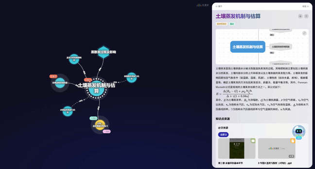 此外,《水文与水资源学》课程知识图谱以人工智能为支柱,运用智能推荐算法根据学习者进度和兴趣推荐资源,具备智能问答功能可实现实时解疑,使学习更轻松。对学生而言,AI辅助提供即时帮助和个性化学习路径。对教师而言,AI分析助力因材施教,调整教学内容。