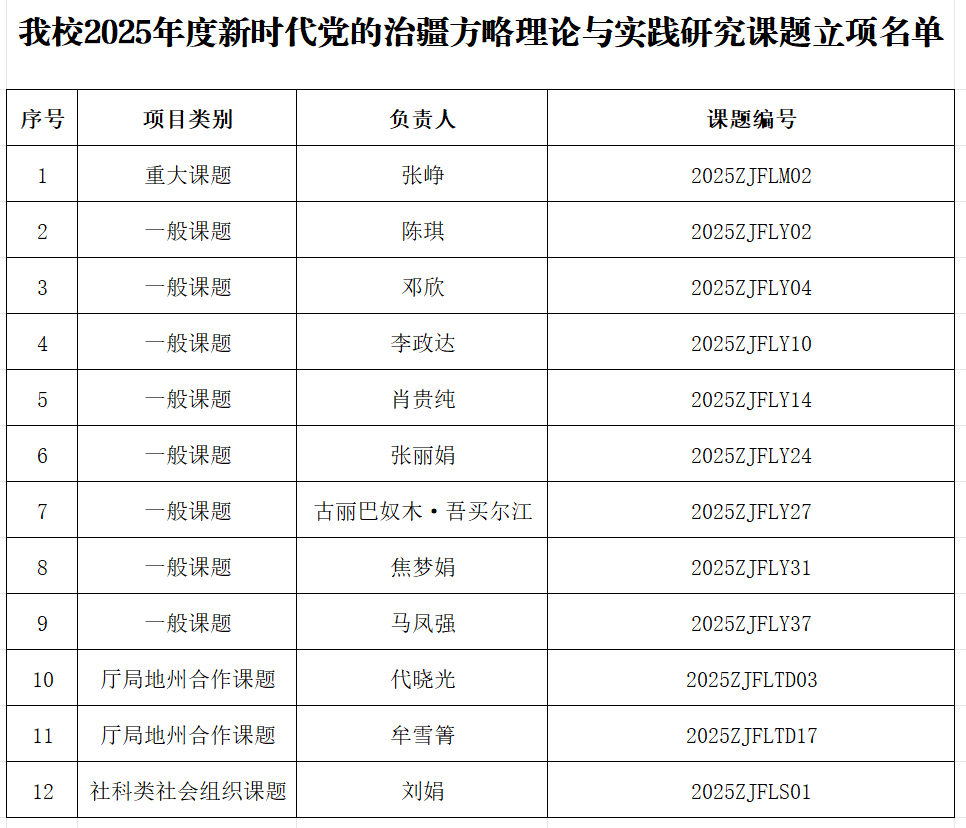 近日,自治区社科联公布了2025年度新时代党的治疆方略理论与实践研究课题立项名单,365英国立项12项,其中重大项目1项、一般项目8项、厅局地州合作项目2项、社科类社会组织课题1项。