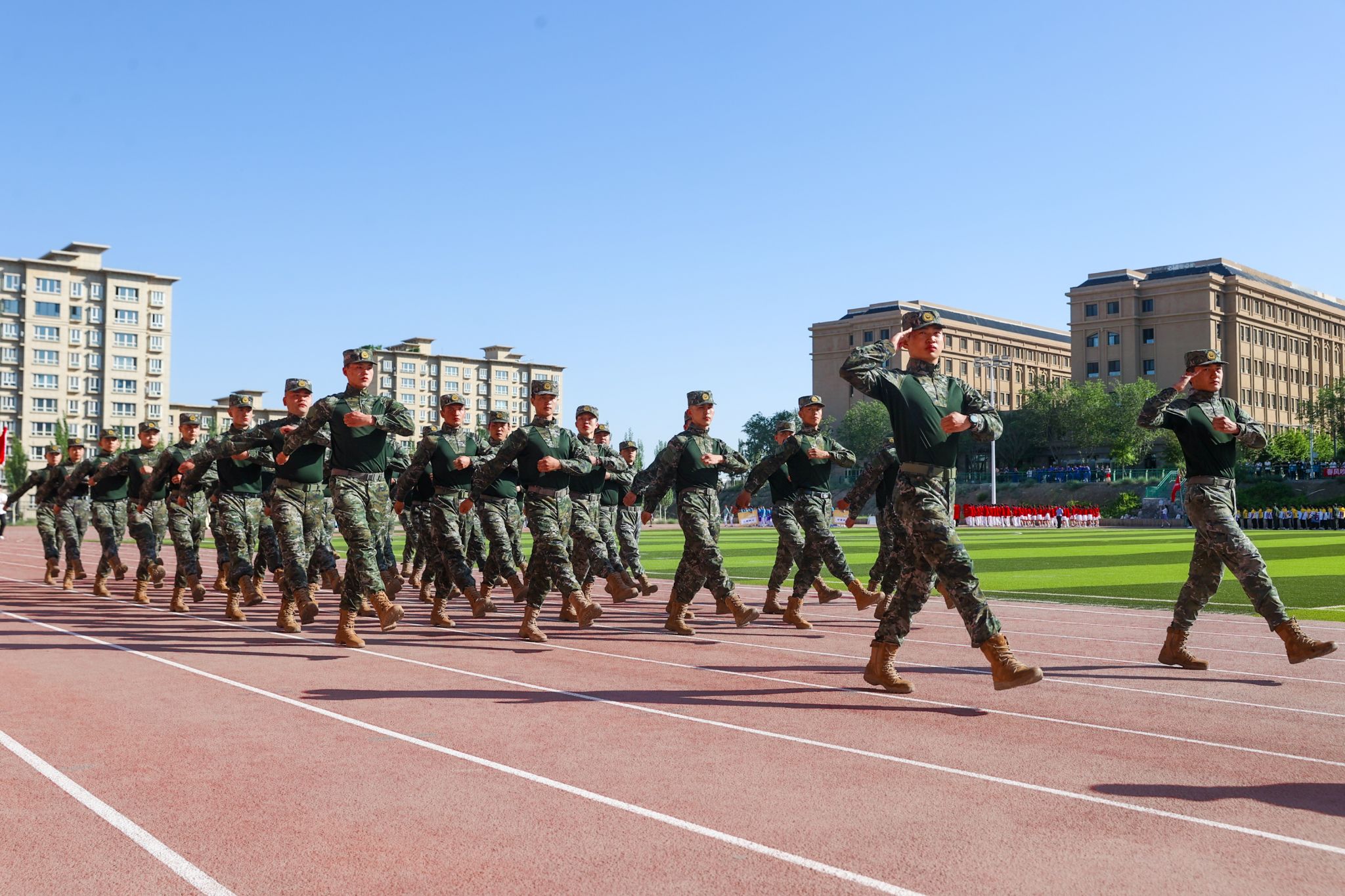 在激昂的音乐声中,国旗方队、退役军人方队、红旗方队、裁判员方队、研究生代表队和各学院代表队身着统一服装、迈着整齐步伐、高喊嘹亮口号通过主席台,接受在场师生的检阅。特色展示环节,各方阵或载歌载舞,或展示标本,“大黄蜂”燃爆全场、“大飞机C919”吸睛夺目,创意连连、精彩无限,展现了青年大学生朝气蓬勃、昂扬向上、奋发有为的精神面貌,赢得了在场师生的阵阵掌声。
