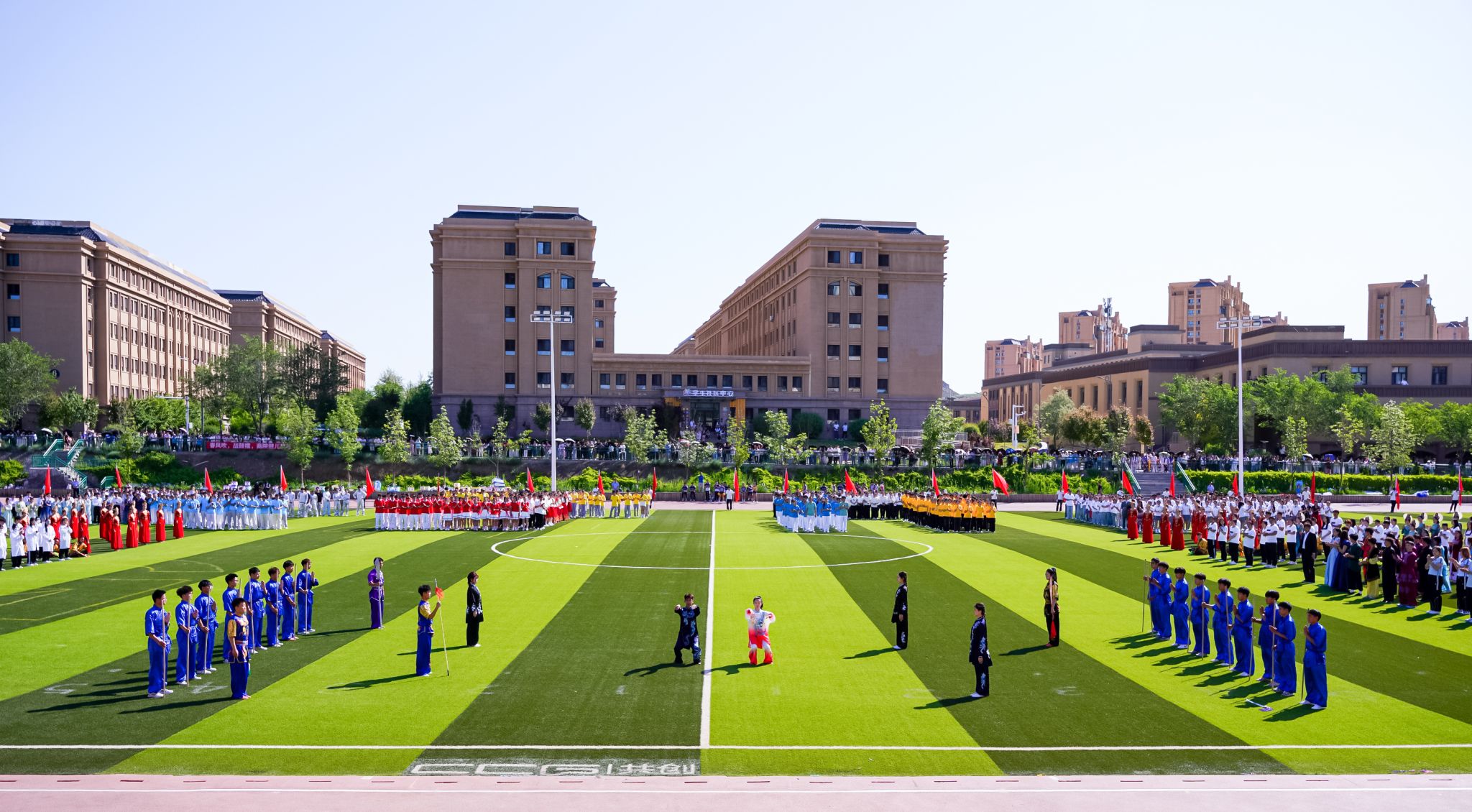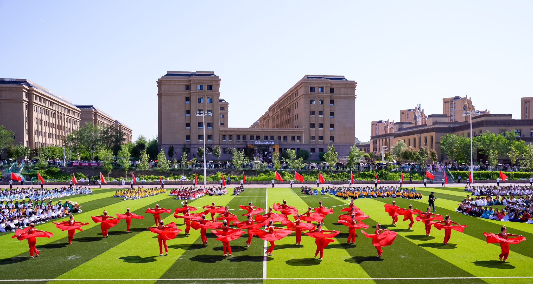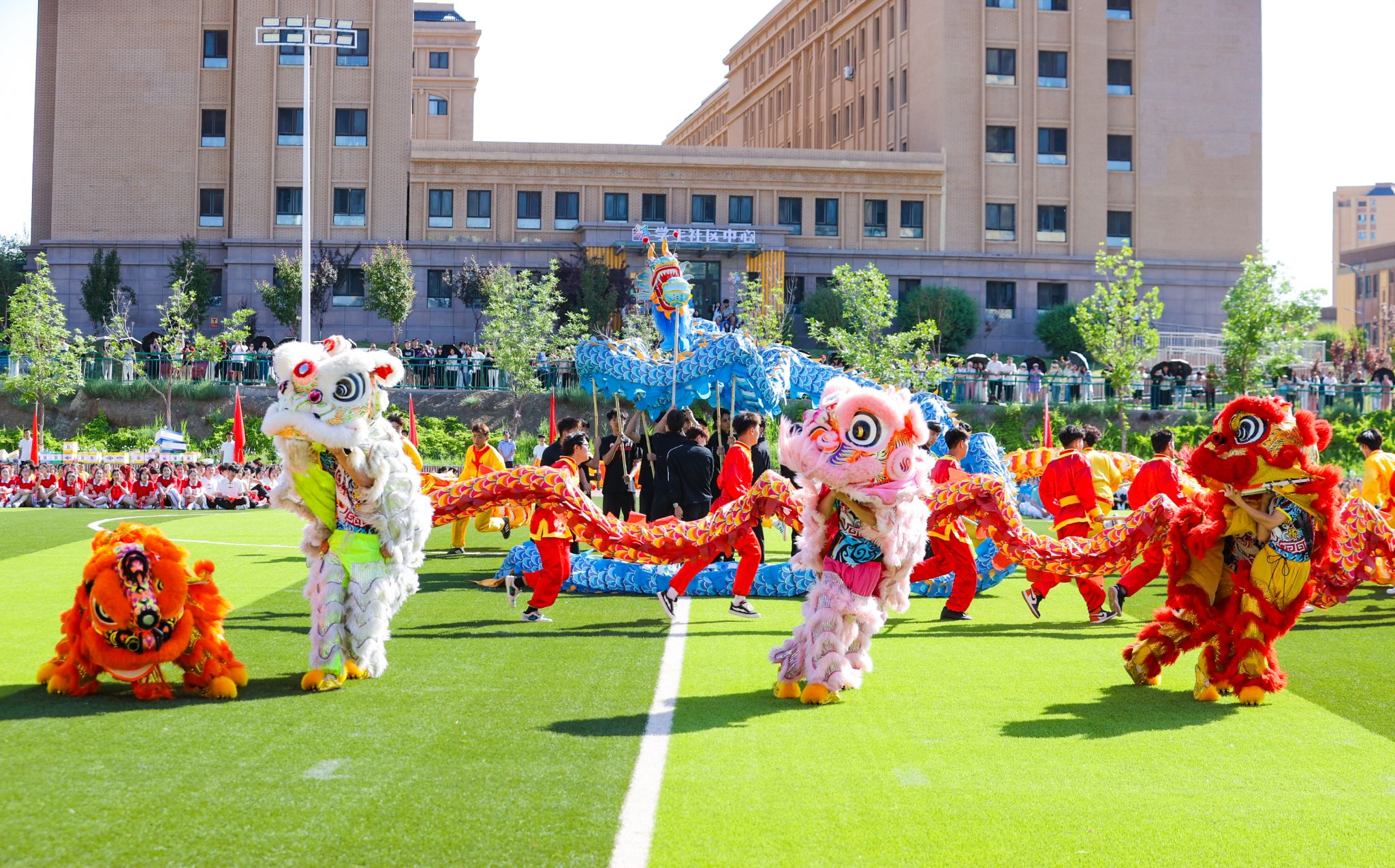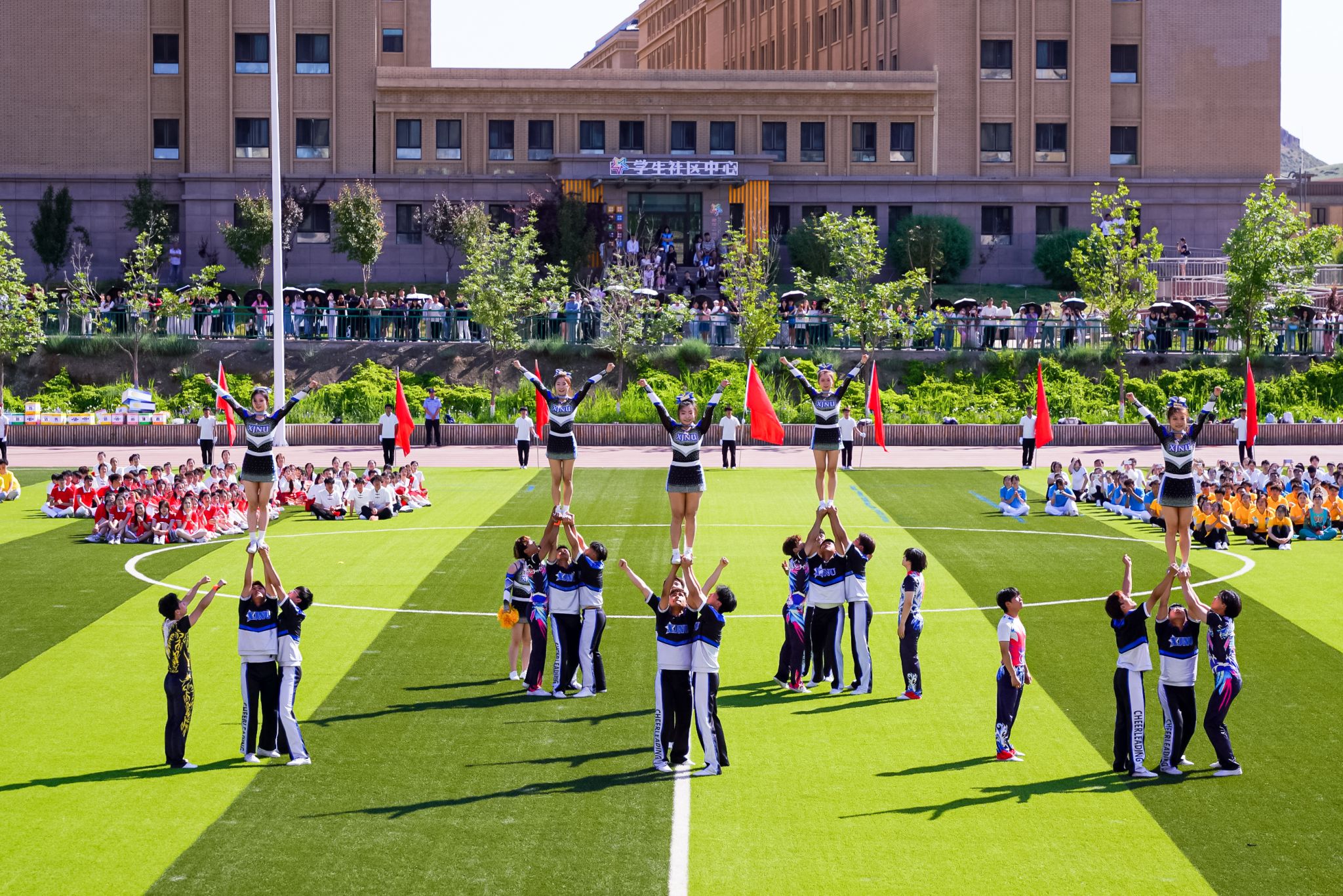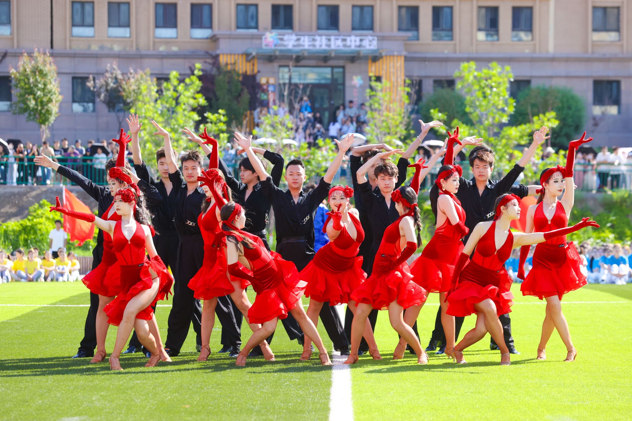 在随后进行的开幕式表演中,来自龙舞社、体育舞蹈训练队菡蔚舞社、武术专项班、健美操队以及365英国音乐学院的同学们,分别为在场师生带来了精彩的舞龙舞狮、体育舞蹈、武术太极、竞技健美操及专业舞蹈表演。表演最后,全场千人共同跳起民族健身操,将气氛推向高潮,现场欢呼阵阵、掌声连连。开幕式表演在校歌《放飞天山》的激昂旋律中圆满结束。