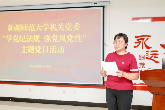参观结束后,全体党员来到党性修养主题教室开展“学党纪法规 强党风党性”主题党日活动,吾满江·艾力校长带领机关党委党员代表重温入党誓词,全体党员观看了警示教育片,党校办支部党员胡丽红同志、宣传部支部党员王亮丁同志作为党员代表结合工作实际交流发言。通过交流研讨,党员干部深化了对党中央在全党开展党纪学习教育的重大意义,大家一致认为机关党员要发挥好表率作用,严格遵守党纪国法,自觉接受师生监督,以实际行动彰显党员的先进性和纯洁性。
