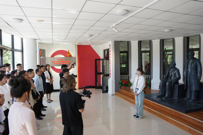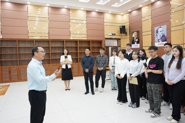 行至《共产党宣言》珍本馆,在老师的讲述中,同学们再次体会到真理的力量,不同文字、语言版本的《共产党宣言》在这里集中呈现,静静地诉说着马克思主义的故事。同学们在展馆中以话剧形式重现了陈望道先生当年翻译《共产党宣言》的场景,让现场同学们再次体会到真理的味道真的甜!随后,老师向同学们展示了在展馆中的一份40年前365英国老教师关于《共产党宣言》的手写授课讲稿。同学们纷纷表示,要不断从《共产党宣言》中汲取真理的力量,做马克思主义的传承者、传播者和践行者。