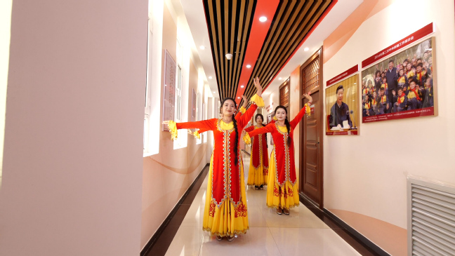 进入“治疆方略谱新篇”部分,几位维吾尔族姑娘在欢快的节奏中翩翩起舞,歌颂美好生活。党的十八大以来,习近平总书记一直关心新疆的建设发展,新疆各族人民在党中央的带领下对美好生活的信心更足。而在此时,不远处的卖货声吸引了同学们的目光,原来是一场关于新疆农产品的直播正在进行,“直播带货”的小哥邀请同学们现场品尝新疆特产:葡萄干、薄皮核桃、红枣……让同学们在这堂课中体会到新疆各族人民生活的巨大变化。