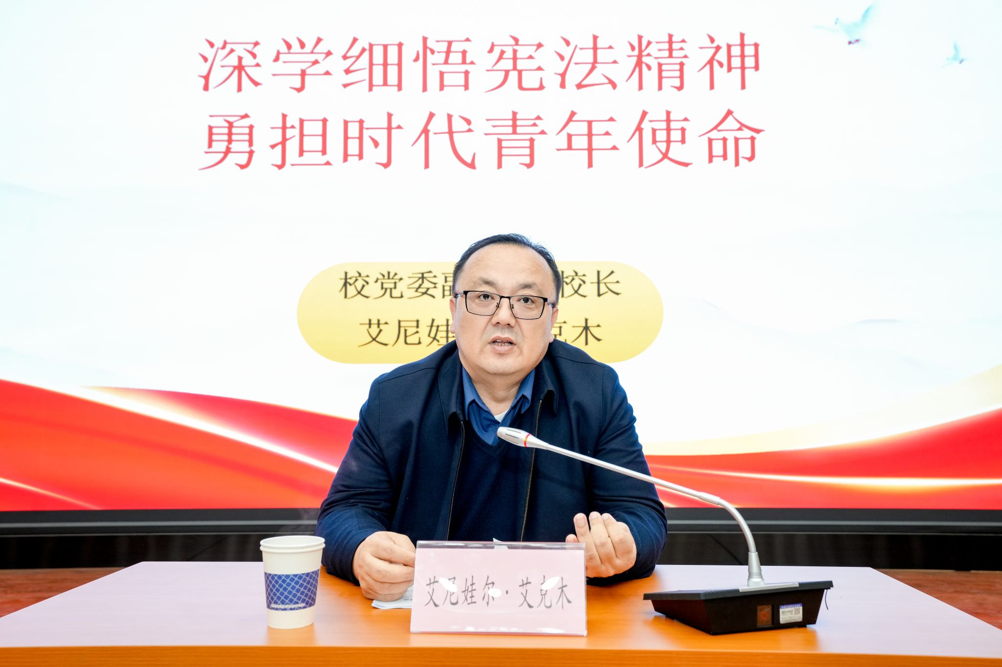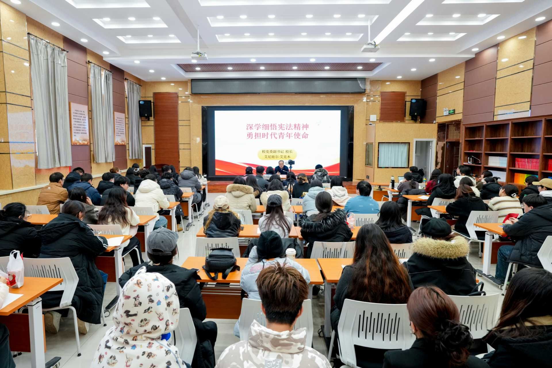 为全面落实立德树人根本任务,充分发挥领导干部在思想政治教育中的示范引领作用,11月7日,校党委副书记、校长艾尼娃尔・艾克木在文汇楼113报告厅,以“深学细悟宪法精神 勇担时代青年使命”为题,为365英国马克思主义学院师生代表100余人讲授思政课。活动由365英国马克思主义学院副院长罗志佳主持。