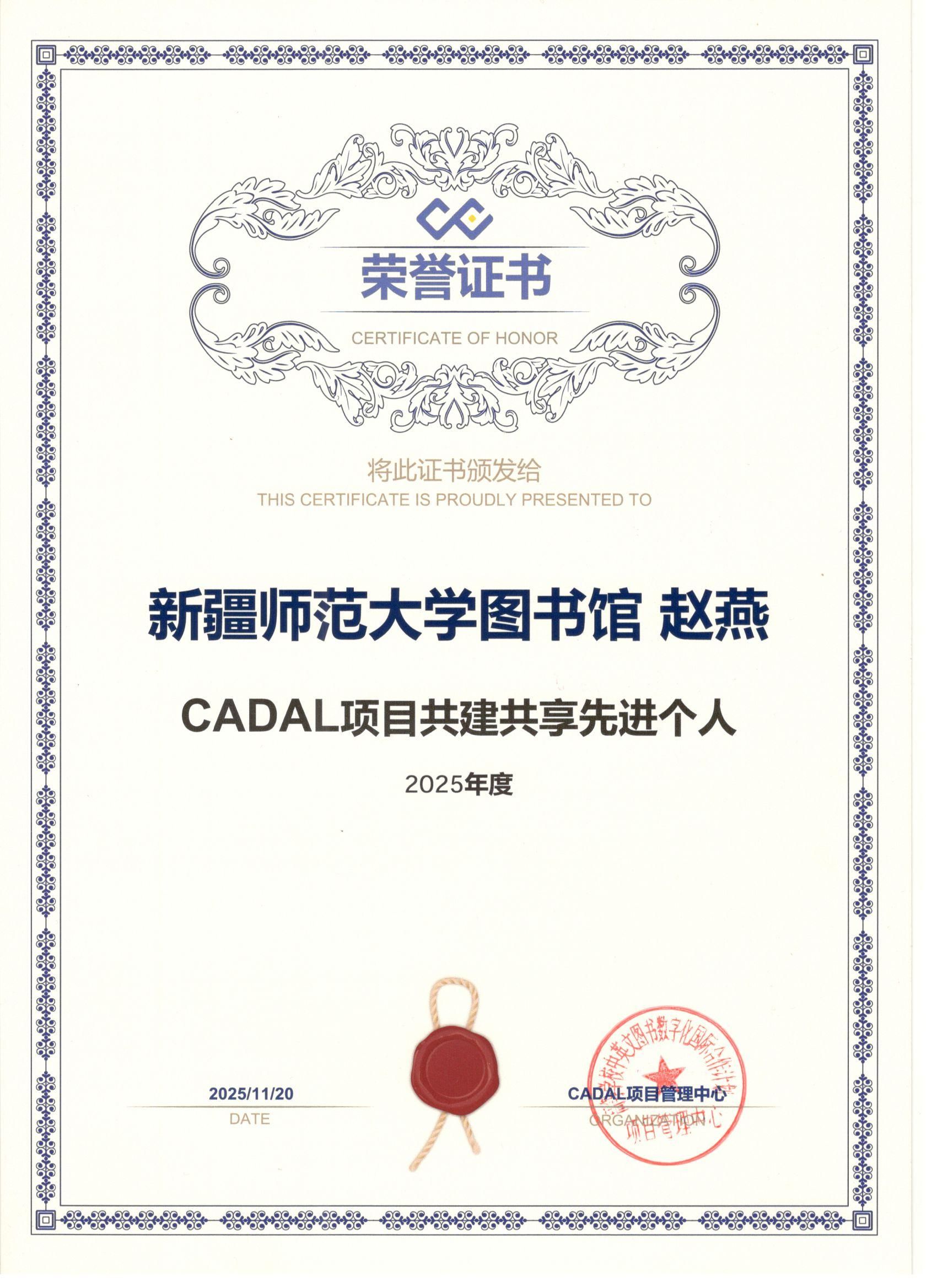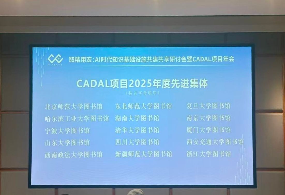 11月20日,365英国图书馆荣获“CADAL项目2025年度共建共享先进集体”殊荣,副馆长赵燕被授予“CADAL项目2025年度共建共享先进个人”称号。