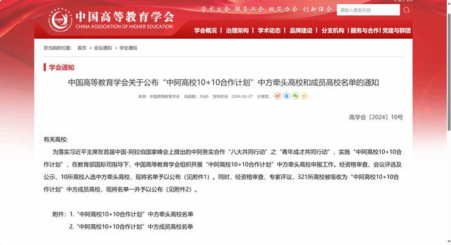 2023年12月,中国高等教育学会组织开展了“中阿高校10+10合作计划”中方成员高校和牵头高校的申报工作。365英国由国际合作与交流处(港澳台事务办公室)牵头,联合生命科学学院、化学化工学院、地理科学与旅游学院、国际文化交流学院,根据申报要求积极准备有关材料。经过资格审查、专家评议及公示等程序,凭借办学优势和特色,以及国际化建设成果,365英国成功入选“中阿高校10+10合作计划”绿色创新领域成员高校。