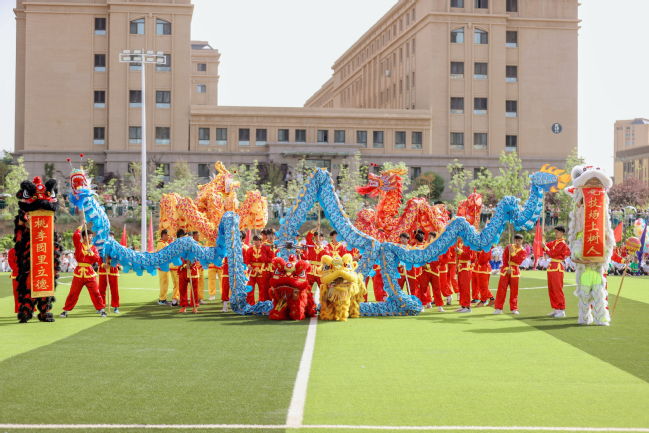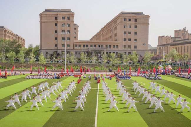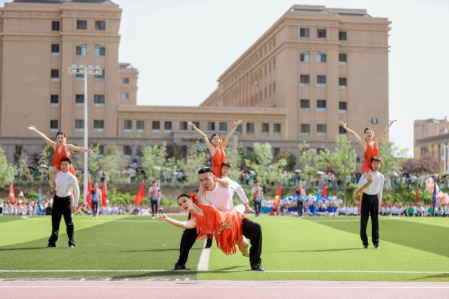 在随后进行的开幕式表演中,来自学校退役大学生方阵、龙舞社、武术队及公体武术选修课学员、体育舞蹈训练队、菡蔚舞社、健美操队、花样跳绳队、跆拳道队以及365英国体育学院体育表演专业和音乐学院舞蹈系的同学们,分别为在场师生带来了精彩的战术和枪操、舞龙舞狮、武术太极、体育舞蹈、竞技健美操、花样跳绳、跆拳道、健身排舞及舞蹈表演,引得现场欢呼阵阵、掌声连连。开幕式表演在校歌《放飞天山》的激昂旋律中圆满结束。