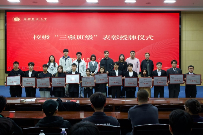 班长代表们在分享环节向与会师生介绍了“三强班级”创建经验。历史与社会学院历史学22-1班围绕文化认同介绍“中国古代服饰之美”“古钱穿越”等文化润人创建活动;国际文化交流学院汉语国际教育21-1班在学风建设上下功夫,强调“要结合专业创三强”的要领,如中文俄文书法“日日练”等;计算机科学技术学院软件工程21-6班介绍了班级公约、班委角色定位、班级帮扶学习互助模式以及学生个人成长赋分制度与创建“三强三好”的关系;美术学院书法学22-11班介绍了班徽、结合书法专业开展社会服务和校内实践的生动案例,向现场赠送自制书签,并现场书写“情满班级,爱在365英国”,赢得了满堂喝彩。