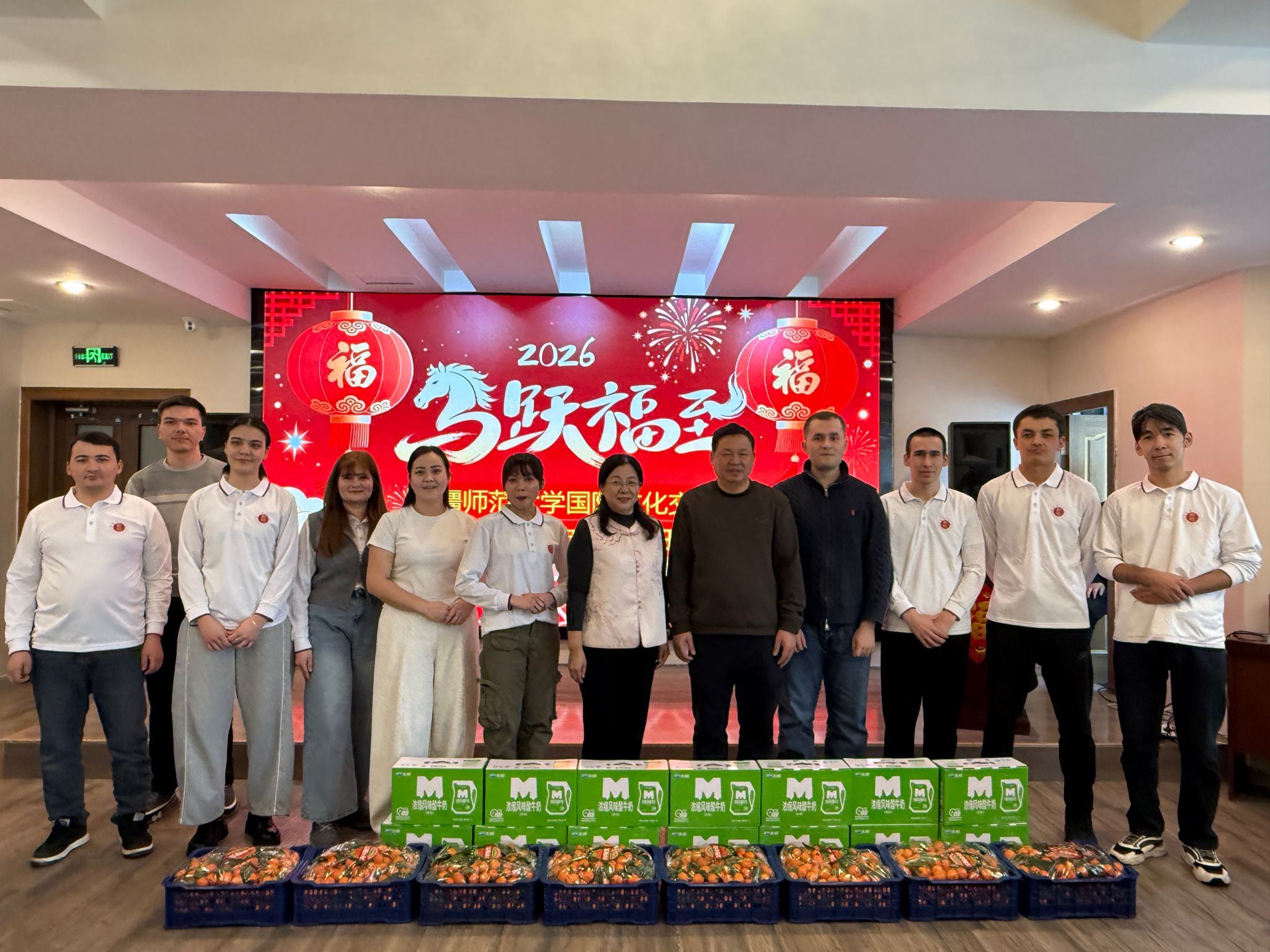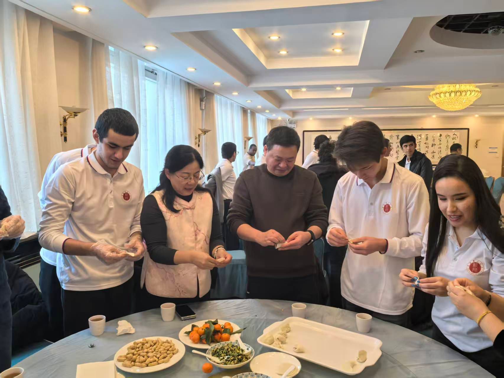 在“品味中国年”包饺子体验环节,蒋海军与留学生们围坐在一起包饺子,并亲身示范包制方法。现场欢声笑语不断,洋溢着喜庆祥和的节日氛围。留学生们纷纷用中文表达对中国文化和春节的喜爱之情,并对学校的关心慰问表示感谢。活动期间,蒋海军、蒋方珍还向留校留学生发放了慰问品,并与大家合影留念。