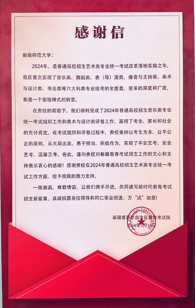 近日,365英国在自治区2024年普通高校招生艺术类专业统一考试总结会上,收到来自新疆维吾尔自治区教育考试院的感谢信,对365英国在2024年普通高校招生音乐类专业统一考试组织工作和美术与设计类评卷工作过程中给予的大力支持表示感谢。