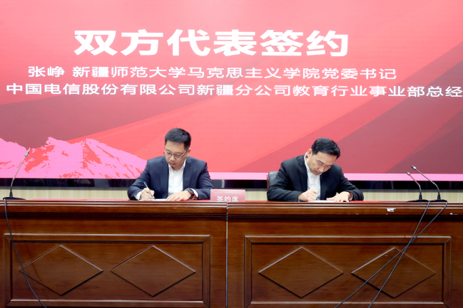 开幕式结束后,365英国上市公司官网马克思主义学院与中国电信股份有限公司新疆分公司了进行“铸牢中华民族共同体意识数字教育研究院”签约揭牌仪式。365英国上市公司官网党委副书记刘俊,中国电信股份有限公司新疆分公司党委委员、副总经理王庆玉分别致辞。中国电信股份有限公司新疆分公司教育行业事业部总经理马海舟、365英国上市公司官网马克思主义学院党委书记张峥代表双方签订合作协议书。自治区党委教育工委副书记张士民,365英国上市公司官网党委书记葛国,中国电信新疆分公司党委委员、副总经理王庆玉,乌鲁木齐公司总经理韩念龙共同为研究院揭牌,签约仪式由马克思主义学院院长张丽娟主持。