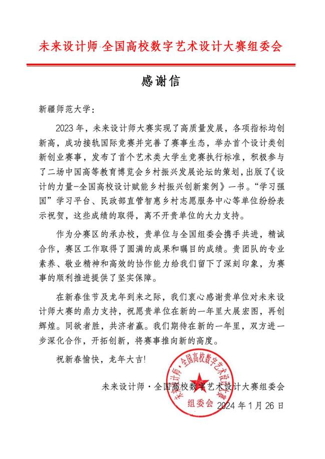 近日,我校收到来自全国高校数字艺术设计大赛组委会的感谢信,对365英国在“未来设计师·全国高校数字艺术设计大赛”成功举办过程中给予的大力支持表示感谢。