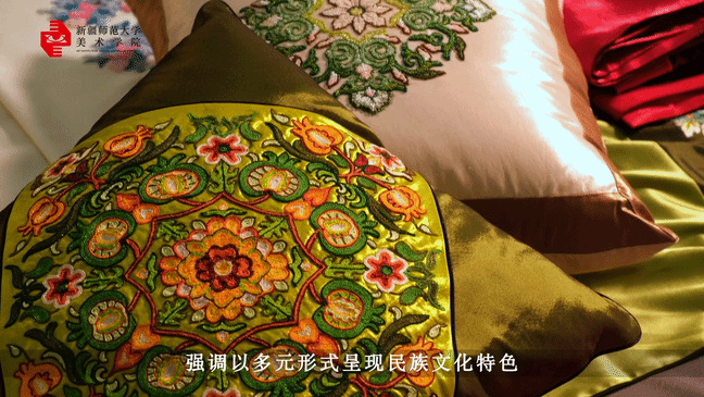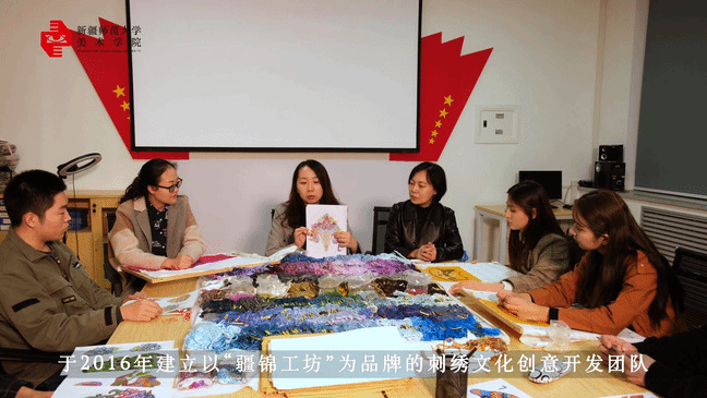 “疆锦工坊”立足于新疆丰富的历史文化资源和中华美学精神,充分挖掘新疆刺绣文化的艺术风格与中华传统文化传承特色,开发具有独特性、审美性与当代视阈的,有地域特色,可使用推广的刺绣民族文创产品。工作坊聚焦机制构建、人才培养、文化融入、设计转化四个层面,以“传承刺绣国粹,弘扬民族文化”为理念,以“让非物质文化遗产接地气儿,用传统民艺的艺术品解构生活”为意愿,以“工匠精神+文化传承+模式创新”为主导的项目式教学模式,依托新疆本土非遗文化优势资源,将非遗请进校园,与传承人传习合作,开发传统技艺现代应用的创新设计。团队师生多次前往、伊犁等地实地调研,通过采样收集遗失在民间的民族刺绣图文集,建立数据库。每年举办四期非物质文化遗产传承人群进校园的专题刺绣培训活动,并联合师生推出了系列新疆少数民族刺绣风格的文创产品。工作坊师生作品多次获得教育部、工信部、中国美术家协会、新疆美术家协会主办的各级各类大赛,实现非遗进校园,在国内多个院校进行推广巡展,联合新疆野马文化发展有限公司、新疆旅游投资有限公司等多家企事业单位进行产品展示推广,实现了设计产品的应用转化。