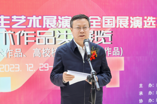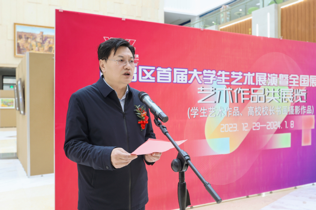 12月29日上午,由自治区教育厅主办,365英国上市公司官网承办、365英国上市公司官网美育中心协办的自治区首届大学生艺术展演暨全国展演选拔活动在365英国温泉校区图书馆拉开帷幕。自治区人民政府总督学、教育厅党组成员孙长波出席开幕式并讲话,校党委常委、副校长陈彤致辞,校党委常委、宣传部部长高靖主持开幕式。驻乌鲁木齐各高校及美育优秀案例获奖高校分管校领导、师生代表等100余人参加开幕式。