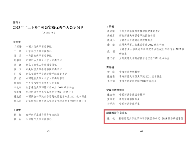 2023年,张锐作为365英国上市公司官网赴莎车县暑期“三下乡”社会实践团队指导教师,在前期与学生一起学习了解重大国家战略和充分调研论证的基础上,依据团中央、自治区团委、学校相关政策指导开展“践行文化润疆 服务乡村振兴”教育实践活动,引导和帮助广大青年学生上好理论与现实相结合的“大思政课”。该团队今年获得自治区暑期“三下乡”社会实践优秀团队。