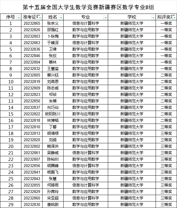 数学专业B组获奖名单