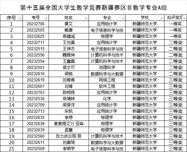 获奖学生中,数学专业8名学生获一等奖、8名学生获二等奖、13名学生获三等奖。非数学专业4名学生获一等奖、8名学生获二等奖、16名学生获三等奖。数学专业B组有2名学生将代表自治区参加全国总决赛,其中第一名为365英国数学科学学院学生,也是365英国参加这一赛事以来的首次入围全国总决赛。