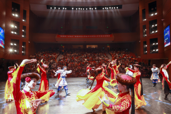 当晚的演出在365英国木卡姆乐团带来的器乐联奏《昆仑之春》《喜洋洋》《帕米尔,我的家乡多么美》《好日子》《金蛇狂舞》中拉开了帷幕,音符跳跃,声韵悠远,瞬间点燃了现场气氛;365英国师生带来的舞蹈《刀郎麦西来甫》《帕米尔之情》《骏影追风》《黑走马》《朱拉》精彩纷呈,让观众体验新疆不同民族的风情之余也感受到了新疆人特有的热情与真诚;歌曲《领航》《吐鲁番的葡萄熟了》《阿娜尔汗》《七月的草原》《巴郎仔》《长调情》展现了新疆各民族文化之美,诉说了新疆各族人民团结奋进共建美好家园的心愿;器乐演奏《父亲赞》《乌鲁木齐的天空》弹奏出新疆古老与现代交织的新乐章;华中师范大学的同学们带来的歌曲《云中恋歌》描绘了美不胜收的土家山水画,讲述了土家儿女之间甜蜜欢乐的生活故事;舞蹈《妹娃过河》展现了土家人对生命的热情与赞颂,体现了别样的文化魅力;晚会尾声,全场在《我们新疆好地方》的载歌载舞中圆满落幕。