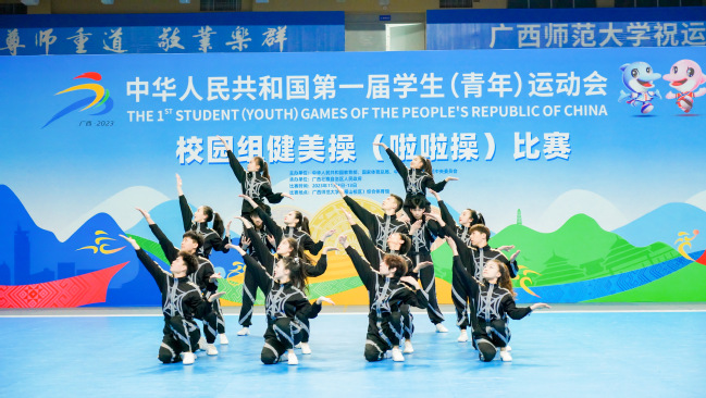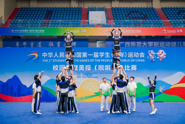 健美操队进行集体技巧啦啦操展示