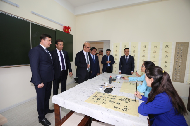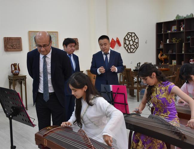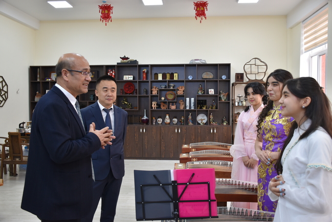 在塔吉克斯坦民族大学孔子学院,吾满江·艾力参观了院史馆、文化体验室、乐器室、书画室、多功能厅等教学设施,并听取了塔吉克斯坦民族大学孔子学院中方院长刘建伟的工作汇报。在与塔吉克斯坦民族大学孔子学院师生的座谈中,吾满江·艾力转达了学校对全体在外教师的关心与慰问,对孔院教师们的辛勤工作和敬业精神给予高度评价,希望他们能够继续立足国际中文教育,为促进中塔文化交流和友谊添砖加瓦。