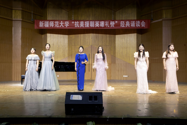诵读会在男声合唱《中国志愿军战歌》中拉开帷幕。“雄赳赳气昂昂,跨过鸭绿江……”激昂奋进的旋律和振奋人心的歌词,诠释了中国人民志愿军在抗美援朝战争中的英勇形象和无畏精神。