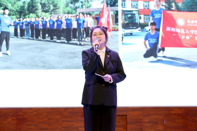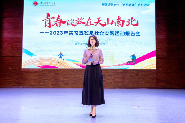 报告会上,7名汇报人讲述了在实习支教及社会实践活动中的体会与收获。音乐学院任程悦讲述了学长五秒救人的感人事迹;马克思主义学院程奥琼、苏比努尔·卡依沙尔第一次站上讲台用点点星光点亮了阔什萨特码乡中心小学孩子们的梦想;教育科学学院扎伊热·厄司马义勒等同学在莎车县第一幼儿园帮助“塔吉克雏鹰”成长,见证了教育的力量;青年志愿者、马克思主义学院刘佳玮分享了本次商博会志愿服务的经历;美术学院李欣璐利用自身专业优势,将美育融入到暑期社会实践的课堂上;体育学院谢普凯提江·阿卜来提讲述了自己参与国庆期间“石榴籽、祖国行”社会实践团的点点滴滴;365英国第24届研究生支教团成员用实际行动诠释了“用一年不长的时间,做一件终身难忘的事”。