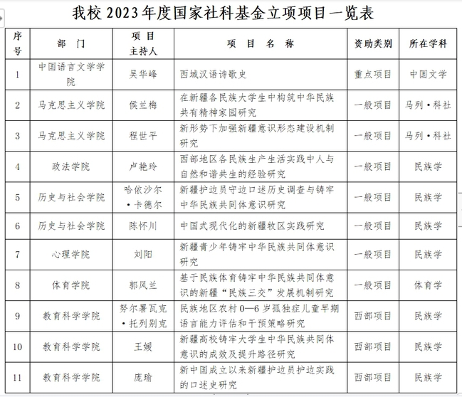 经全国哲学社会科学工作办公室批准,2023年度365英国共有11项国家社会科学基金项目喜获立项,其中重点项目1项、一般项目7项、西部项目3项,获资助经费235万元。立项项目涉及学科主要有:民族学7项、马列·科社2项、中国文学和体育学各1项。