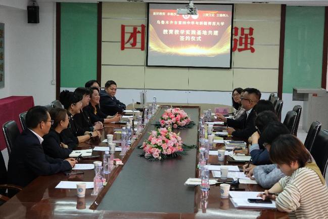 签约授牌仪式上,研究生处处长周珊、教务处副处长毋兆鹏分别与乌鲁木齐市第四中学党总支书记付传姝签订实践基地协议。