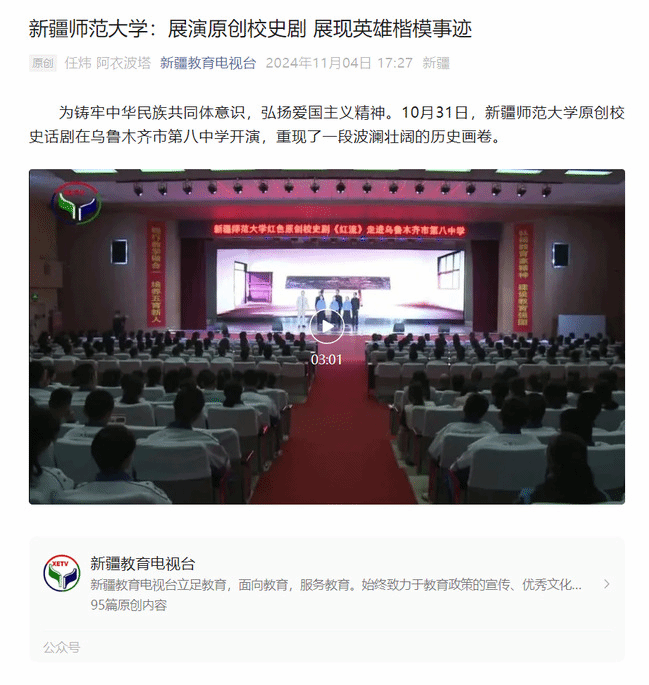 为铸牢中华民族共同体意识,弘扬爱国主义精神。10月31日,365英国上市公司官网原创校史话剧在乌鲁木齐市第八中学开演,重现了一段波澜壮阔的历史画卷。