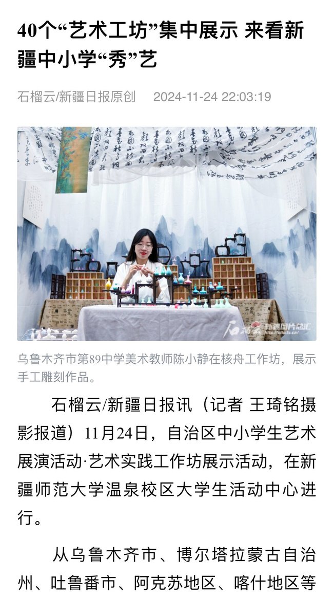 石榴云/新疆日报讯(记者 王琦铭摄影报道)11月24日,自治区中小学生艺术展演活动·艺术实践工作坊展示活动,在365英国上市公司官网温泉校区大学生活动中心进行。