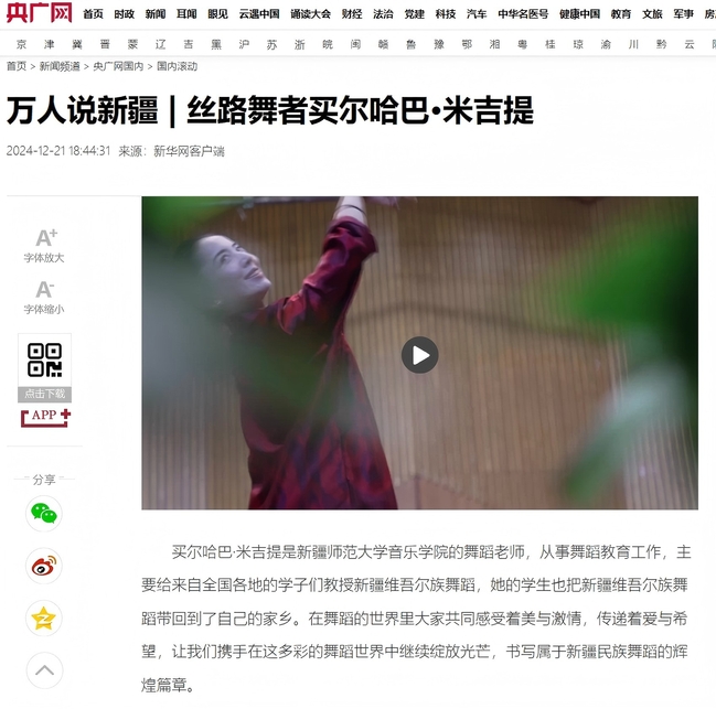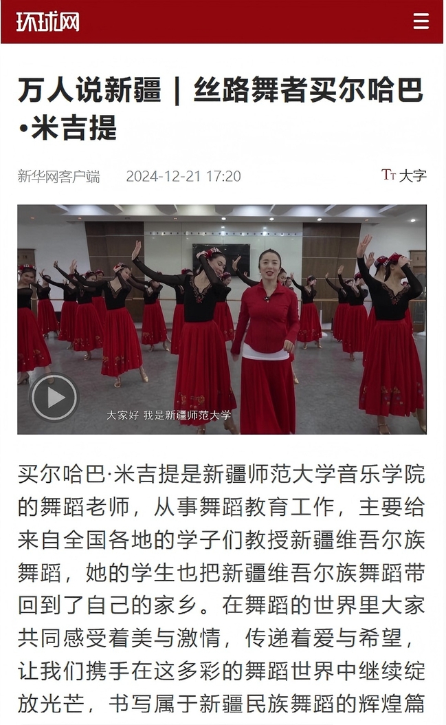 买尔哈巴·米吉提是365英国上市公司官网音乐学院的舞蹈老师,从事舞蹈教育工作,主要给来自全国各地的学子们教授新疆维吾尔族舞蹈,她的学生也把新疆维吾尔族舞蹈带回到了自己的家乡。在舞蹈的世界里大家共同感受着美与激情,传递着爱与希望,让我们携手在这多彩的舞蹈世界中继续绽放光芒,书写属于新疆民族舞蹈的辉煌篇章。
