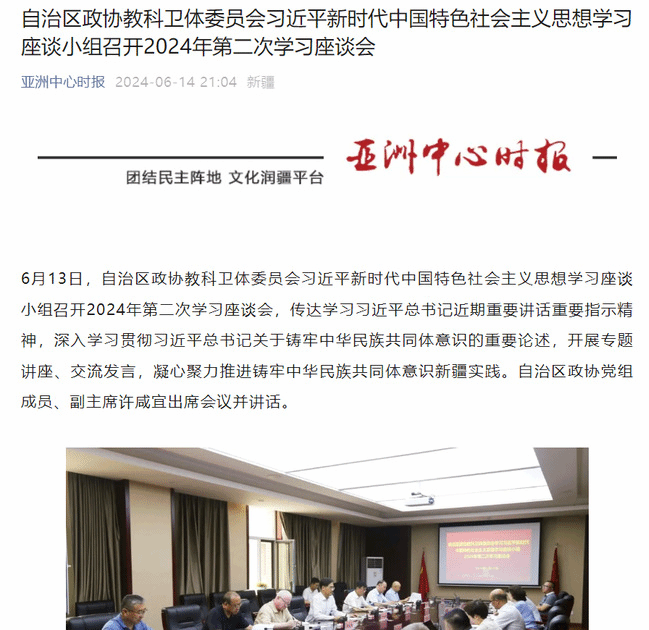 6月13日,自治区政协教科卫体委员会习近平新时代中国特色社会主义思想学习座谈小组召开 2024年第二次学习座谈会,传达学习习近平总书记近期重要讲话重要指示精神,深入学习贯彻习近平总书记关于铸牢中华民族共同体意识的重要论述,开展专题讲座、交流发言,凝心聚力推进铸牢中华民族共同体意识新疆实践。自治区政协党组成员、副主席许咸宜出席会议并讲话。