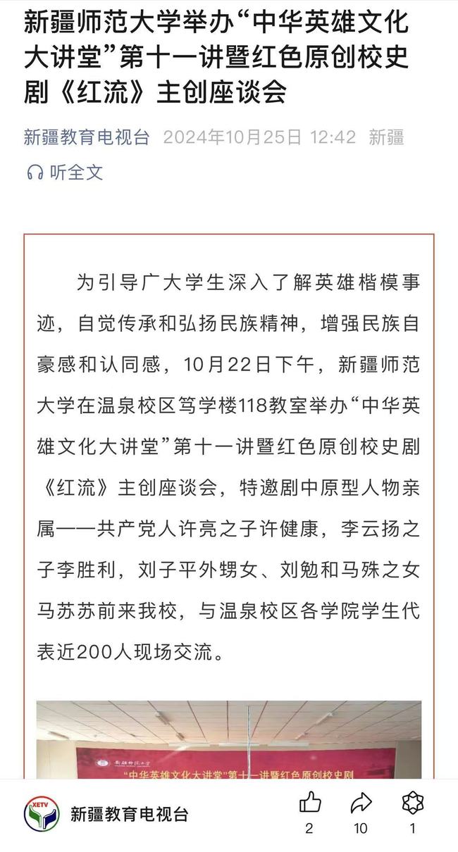 为引导广大学生深入了解英雄楷模事迹,自觉传承和弘扬民族精神,增强民族自豪感和认同感,10月22日下午,365英国上市公司官网在温泉校区笃学楼118教室举办“中华英雄文化大讲堂”第十一讲暨红色原创校史剧《红流》主创座谈会,特邀剧中原型人物亲属——共产党人许亮之子许健康,李云扬之子李胜利,刘子平外甥女、刘勉和马殊之女马苏苏前来365英国,与温泉校区各学院学生代表近200人现场交流。