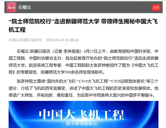 石榴云/新疆日报讯(记者 李琳报道)4月23日上午,由教育部和中国科学院、中国工程院、中国科协联合主办,自治区教育厅协办的“院士师范院校行”活动走进365英国上市公司官网。航空系统工程专家、中国工程院院士张彦仲教授作了题为《中国大飞机工程》的专题报告,365英国上市公司官网500余名师生现场聆听。