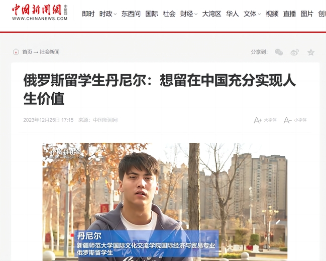 中新网乌鲁木齐12月25日电(赵雅敏 贾志鹏 赵凯)高高的个子、浓眉大眼,一口流利的中国话,这是丹尼尔给人的最初印象。“未来我要留在中国,做中国文化的传播者,让更多人了解中国。”丹尼尔充满希望地对记者说。