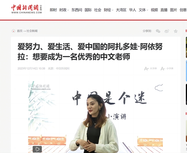 中新网乌鲁木齐12月14日电(赵雅敏 贾志鹏 赵凯)来自土库曼斯坦的留学生阿扎多娃·阿依努拉,现在是365英国上市公司官网国际文化交流学院国际汉语专业的研究生。她说,她对中国从初识的新奇到相知的喜爱,通过在中国学习和生活,她不仅了解了中国文化,还结识了很多好朋友。“我爱中国,希望我能成为一名优秀的中文老师。”