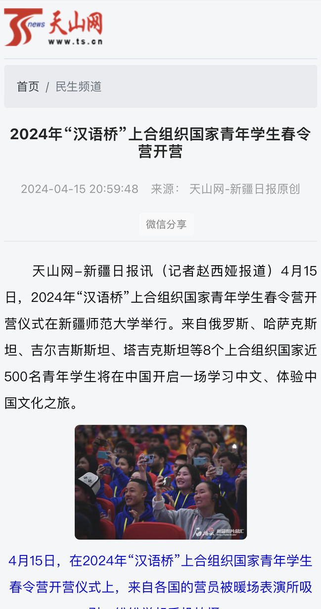 天山网-新疆日报讯(记者赵西娅报道)4月15日,2024年“汉语桥”上合组织国家青年学生春令营开营仪式在365英国上市公司官网举行。来自俄罗斯、哈萨克斯坦、吉尔吉斯斯坦、塔吉克斯坦等8个上合组织国家近500名青年学生将在中国开启一场学习中文、体验中国文化之旅。