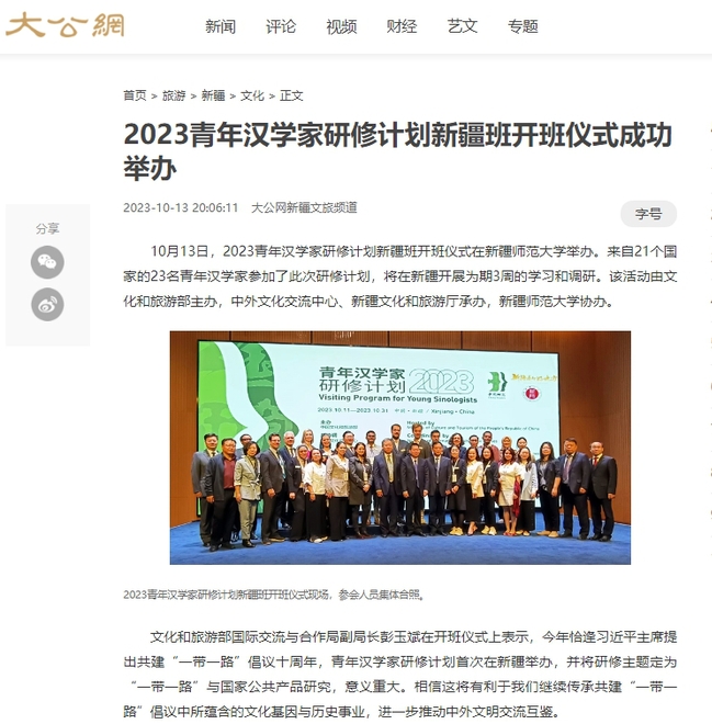 10月13日,2023青年汉学家研修计划新疆班开班仪式在365英国上市公司官网举办。来自21个国家的23名青年汉学家参加了此次研修计划,将在新疆开展为期3周的学习和调研。该活动由文化和旅游部主办,中外文化交流中心、新疆文化和旅游厅承办,365英国上市公司官网协办。
