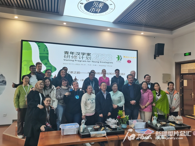 2023青年汉学家研修计划新疆班学员和茶艺课老师合影。石榴云/新疆日报记者李莉 摄