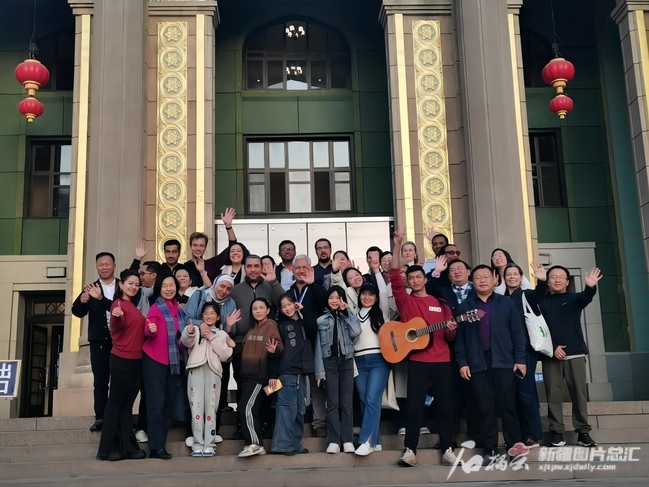 新疆人民剧场前,2023青年汉学家研修计划新疆班学员和古兰丹姆伊犁百年古法手工冰淇淋店店员、乌鲁木齐市民一起合影。石榴云/新疆日报记者李莉 摄