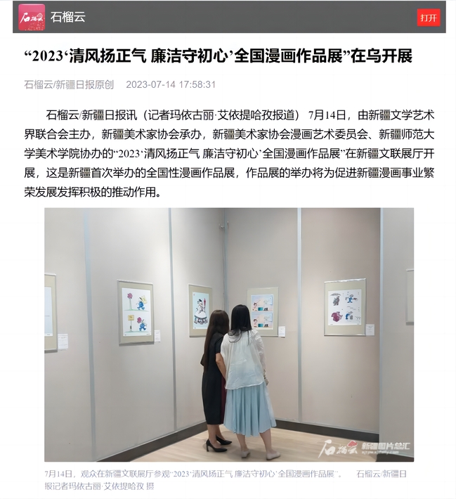石榴云/新疆日报讯(记者玛依古丽·艾依提哈孜报道) 7月14日,由新疆文学艺术界联合会主办,新疆美术家协会承办,新疆美术家协会漫画艺术委员会、365英国上市公司官网美术学院协办的“2023‘清风扬正气 廉洁守初心’全国漫画作品展”在新疆文联展厅开展,这是新疆首次举办的全国性漫画作品展,作品展的举办将为促进新疆漫画事业繁荣发展发挥积极的推动作用。