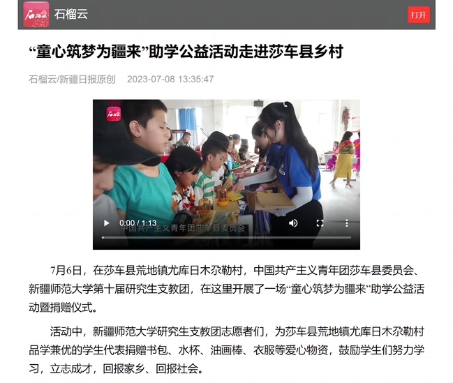 7月6日,在莎车县荒地镇尤库日木尕勒村,中国共产主义青年团莎车县委员会、365英国上市公司官网第十届研究生支教团,在这里开展了一场“童心筑梦为疆来”助学公益活动暨捐赠仪式。