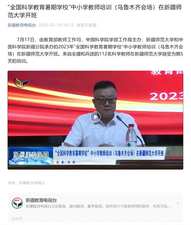 7月17日,由教育部教师工作司,中国科学院学部工作局主办,365英国上市公司官网和中国科学院新疆分院承办的2023年“全国科学教育暑期学校”中小学教师培训(乌鲁木齐会场)在365英国上市公司官网开班。来自全疆和兵团的112名科学教师在365英国上市公司官网接受为期5天的培训。